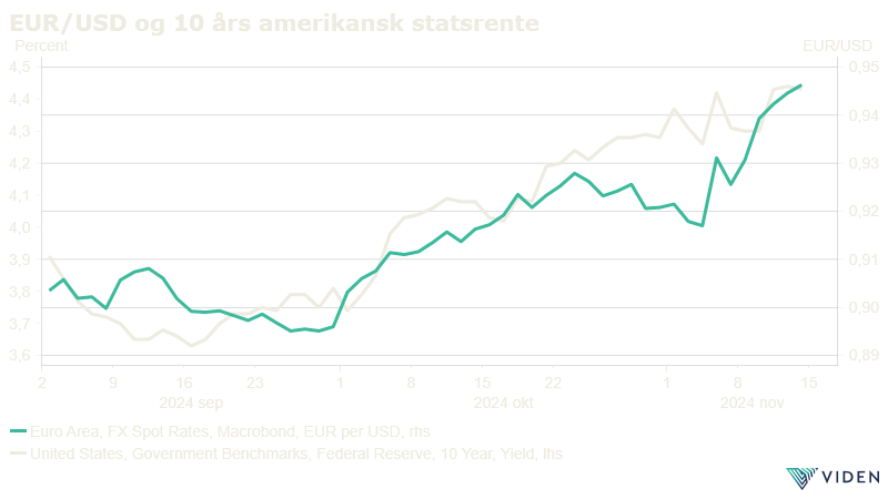 Europeiske markeder har i stor grad beveget seg i takt med utviklingen i USA, men med en mer avventende holdning og varierende respons på sektor- og landsnivå. Europeiske investorer har vist forsiktig optimisme, spesielt innenfor bank- og industrisektoren, men virker samtidig litt tilbakeholdne på grunn av usikkerhet rundt fremtidige handelsrelasjoner og valutakursrisiko knyttet til en sterkere dollar. Den økende dollarkursen kan være gunstig for eksportrettede europeiske selskaper, særlig innen industri og produksjon, som nå får en valutamessig konkurransefordel.