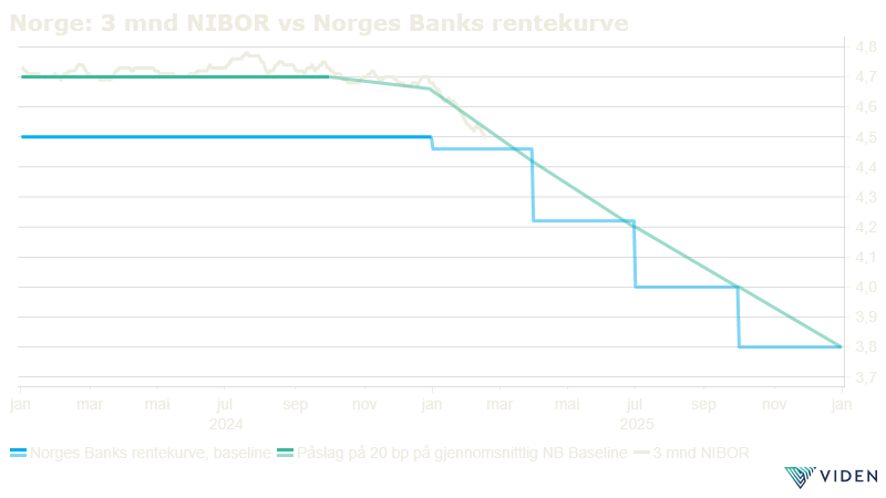 Utslagene i rentemarkedet har naturlig nok vært mindre. Hvis vi ser på durasjoner (løpetid) over 5 år går de fleste landene i takt, og det generelle bildet er at rentene steg fram mot midten av januar – for deretter å skli litt tilbake. Den norske 5-års swap-renten toppet ut på 4,27 % 14.januar, og rentene er nå omtrent 25 bp lavere. Utviklingen i kredittspreadene har også vært relativt udramatiske til tross for at det jevnt over er lavere enn de historisk har vært. NIBOR-renten begynner nå å ta inn over seg at styringsrenten er på vei nedover. Sammenhengen mellom 3-måneders NIBOR og rentekurven har vært ekstremt tett i en lang periode nå, og nedgangen den siste måneden følger også forventningene til styringsrenten svært tett. Under forutsetning om tre rentenedsettelser i år, kan vi forvente ytterligere nedgang i 3 måneders NIBOR ned mot 3,8 % i løpet av året. Dette vil dra ned avkastningen i den korte enden av rentekurven ganske betraktelig, og det er grunn til å vente at de lange rentene vil betale bedre enn korte renter året sett under ett.