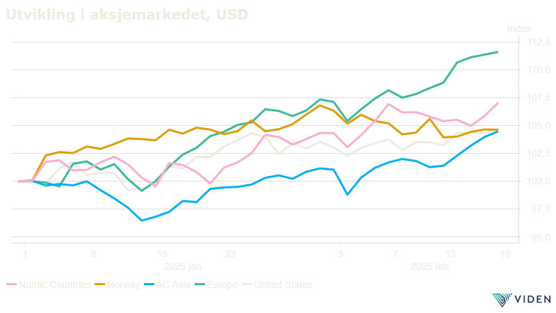 Slutten av 2024 var preget av en voldsom vekst i amerikanske aksjer, mens resten av verden steg mindre. Dette bildet er imidlertid endret i år, mens amerikanske aksjer har stått stille, har det europeiske aksjemarkedet steget med nesten 10 %. De 10 største selskapene i USA har per midten av februar falt i verdi. Tesla kan skilte med et fall på 13 %, mens Nividia som på det verste var ned det med omtrent samme prosent, er marginalt i pluss. Mye av gapet som oppstod mellom USA og Europa mot slutten av fjoråret er dermed lukket.