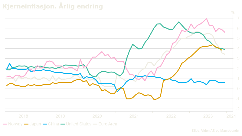 Inflasjonen har stort sett nådd markedet på samme måte de fleste steder. Det begynte med et umiddelbart sjokk innen transport som både kom som en følge av gjenåpningen etter Korona og etter krigsutbruddet i Ukraina. Dette slo i hovedsak inn på samleposten transport. Bølge to rammet varer og tjenester hvor lønninger utgjør en stor del av kostnadene. Eksempler på dette er matvarer og helse og omsorg. Bølge tre rammet i større grad rentesensitive varer, bolig er et viktig eksempel her. Når det gjelder bolig er det greit å skille mellom det å kjøpe en bolig, som ikke inngår i konsumprisindeksen, og det å leie en bolig, som vil påvirke konsumprisindeksen. Med dette som bakteppe kan vi se at utviklingen i inflasjonen har truffet forskjellige regioner litt forskjellig, både med hensyn til styrke og fart. Man må også ta høyde for at forskjellige regioner vekter inflasjonskomponentene forskjellig, og at energiforsyningen er forskjellig. Invasjonen i Ukraina rammet for eksempel europeiske energipriser vesentlig hardereenn energiprisene i USA eller Japan.