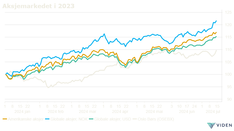 For rentemarkedet har kanskje den viktigste nyheten vært at det amerikanske arbeidsmarkedet begynner å slå litt sprekker. Utslagene er fortsatt små, men vi kan så vidt skimte konturene av at renteoppgangen begynner å merkes. Powel konkluderte også ved siste rentemøte at arbeidsmarkedet ikke lengre er inflasjonsdrivende. Denne nyheten plusset på ett rentekutt (0,25 %) i markedets forventninger til Fed i år. Tradisjonelt er det mindre smitte mellom land for korte renter enn for lange, men vi kan øyne tilsvarende, om enn noe mindre, bevegelse også andre steder. Norge følger en noe annerledes syklus enn mange andre land, og selv lavere inflasjon enn forventet evnet ikke å rokke ved 3 mnd NIBOR som har vært unormalt flat mellom 4,7 % og 4,75 % i nesten ett år. De lange rentene trendet imidlertid ned på disse nyheten i Norge. 10 års stat falt med mellom 15 og 20 bp og er i midten av juli på omtrent 3,5 %. Intensjonalt beveget de lange rentene seg mindre