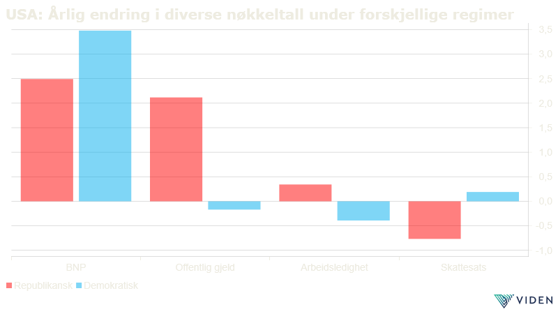 Historisk har den store avveiningen i amerikansk politikk vært om man etter valget sitter igjen med en republikansk eller demokratisk president. Vi har sett tilbake på de historiske forskjellene mellom de to partiene med tanke på utviklingen innen viktige økonomiske parameter. Først vil vi se litt på BNP-vekst, Offentlig gjeld og arbeidsledighet. Intuitivt skulle man forventet at den offentlige gjelden ville vokst mindre under republikanske presidenter, men at det ville vært på bekostning av en høyere arbeidsledighet under republikansk styre. Det er vel også nærliggende å tro at BNP-veksten om noe skulle vært sterke under republikansk styre. De fleste av disse intuitive konklusjonene viser imidlertid seg å være gale. Vi har sett på perioden siden 1960, dvs. nesten 65 år med 379 og 396 måneder med henholdsvis demokratisk og republikansk styre. Det mest overraskende funnet er kanskje at for hvert år under republikansk styre har den offentlige gjelden økt med 2,1% av BNP, mens tilsvarende tall for demokratisk styre er -0,2%. Stikk i strid med den gjengse oppfatningen om gjeldsopptak, så synes det altså som om demokratene evner å utøve den mest økonomisk ansvarlige politikken. Videre synes ikke dette å ha gått på bekostning av arbeidsledigheten. For hvert år under demokratisk styre har arbeidsledigheten i gjennomsnitt sunket med 0,35 %, mens tilsvarende for republikansk styre er en økning på det samme, 0,35 %. I tillegg har demokratiske styre i gjennomsnitt vært sammenfallende med en reallønnsvekst på 3,6 %, mens republikanerne bare har oppnådd 2,5 %. Det er klart at man kan argumentere med at disse tallene til en viss grad henger sammen. Høy vekst gir gjerne lavere arbeidsledighet, og lavere arbeidsledighet gir mindre behov for offentlig støtte og høyere skatteinngang som hjelper på de offentlige budsjettene. Vi har kun etablert at det er en korrelasjon her, ikke en kausalitet, dvs. at regimet har forårsaket disse forskjellene. Det er f.eks. vanskelig å klandre republikanerne for at Covid rammet den amerikanske økonomien i 2020, en periode som alene bidro til å øke det gjennomsnittlige gjeldsopptaket under republikansk styre med 0,5 prosentpoeng.