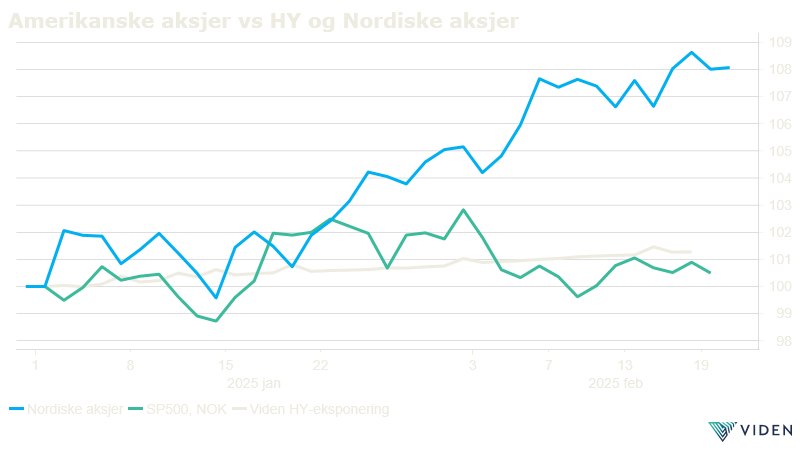 Slutten av 2024 var preget av en voldsom vekst i amerikanske aksjer, mens resten av verden steg mindre. Dette bildet er imidlertid endret i år, mens amerikanske aksjer har stått stille, har det europeiske aksjemarkedet steget med nesten 10 %. De 10 største selskapene i USA har per midten av februar falt i verdi. Tesla kan skilte med et fall på 13 %, mens Nividia som på det verste var ned det med omtrent samme prosent, er marginalt i pluss. Mye av gapet som oppstod mellom USA og Europa mot slutten av fjoråret er dermed lukket.