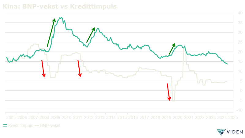 Kina lanserte i oktober i fjor en storstilt satsing for å få fart på økonomien igjen. Kort oppsummert var planen å gjøre kapital tilgjengelig og billig. Myndighetene skisserte en plan hvor omtrent 1 % av kinesisk BNP ble lagt på bordet. Stimulansene skulle i første rekke kanaliseres gjennom bankene og komme bygg og anlegg til gode. Kina følger med det mønsteret fra tidligere stimulansepakker. En måte å følge dette er å på er å se på kreditt-impulsen, dvs. en oversikt over hvordan utlån utvikler seg i forhold til BNP. En oppgang i dette tallet er et tegn på stimulanser. Per januar var det ingen tegn på at kredittmotoren i Kina har startet.