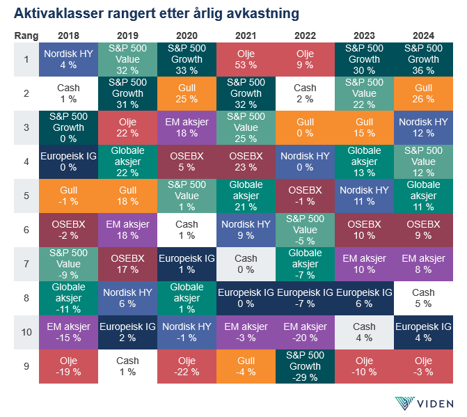 2024 ble nok et svart godt år i finansmarkedene, og vinnerne og taperne ble omtrent de samme som i 2023. Av et utvalg investeringsmuligheter var igjen amerikanske vekst-aksjer på toppen, mens olje var på bunnen.