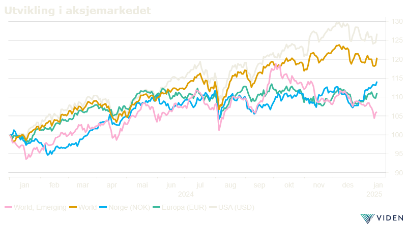 De aller fleste aksjemarkedene ga en hyggelig reise i 2024, men det er en kjensgjerning at mye av oppgangen var konsentrert rundt et fåtall selskaper i USA. Av en oppgang på 22,7 % i den amerikanske SP500-indeksen i 2024, kan 14 % forklares av kun 10 selskaper. Når vi i tillegg vet at den amerikanske børsen utgjør over 60 % av de globale aksjeindeksene, er det lett å se at oppgangen er konsentrert.