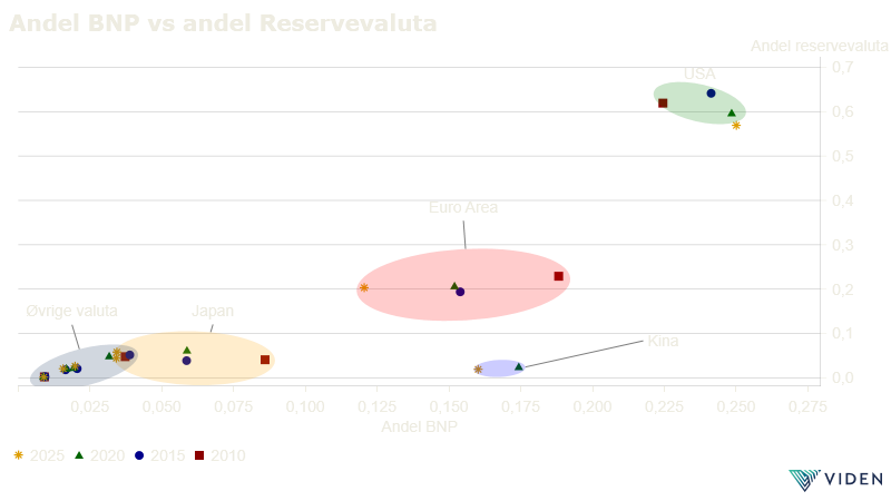 I dette perspektivet fremstår USA fortsatt som en klar outlier. Med rundt en fjerdedel av global BNP, men godt over halvparten av verdens reserver, er dollar betydelig overrepresentert. Samtidig er euro og yen bemerkelsesverdig stabil i andel av global reservevaluta til tross for fallende andeler av global økonomi. Dette illustrerer en betydelig treghet i systemet. Reservevalutaer endres langsomt, og historisk posisjon og institusjonell kvalitet spiller en avgjørende rolle.